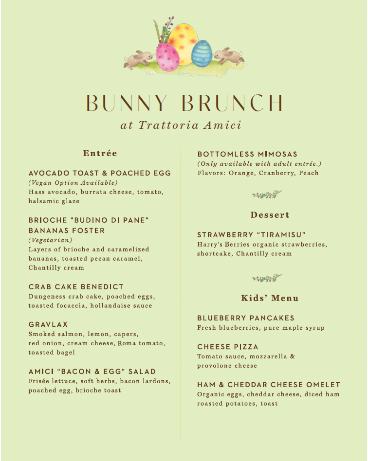 Join us for a festive and delicious family feast at Trattoria Amici, featuring an exclusive visit from the Easter Bunny! Making the celebration even sweeter, they’re offering bottomless mimosas for the adults and goodie bags for the kids.